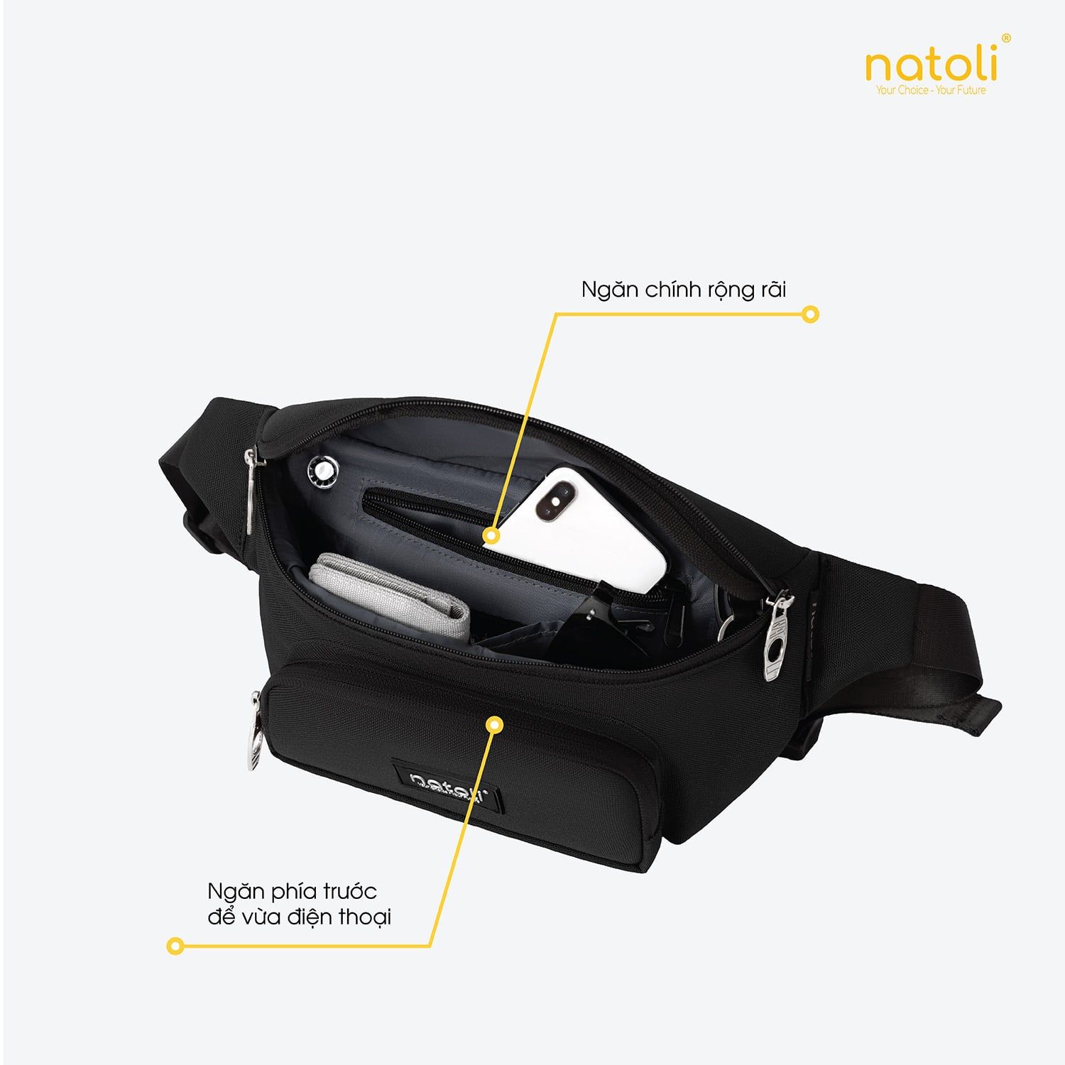 - Ngăn lớn túi đeo chéo Natoli: Để passport, điện thoại, bặt lửa và các phụ kiện khác.