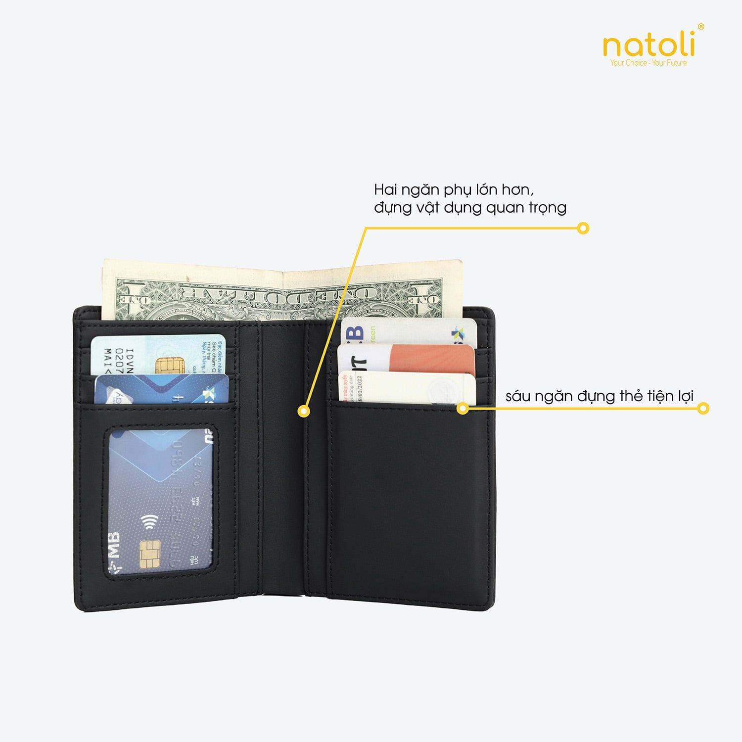 Thiết kế hiện đại đem sự tối giản đặt lên hàng đầu dành cho ví nam Natoli mang đến sự tiện lợi cho người sử dụng thiết kế ngăn chứa bao gồm : 2 ngăn đựng đựng tiền và nhiều khe nhỏ để đựng thẻ...